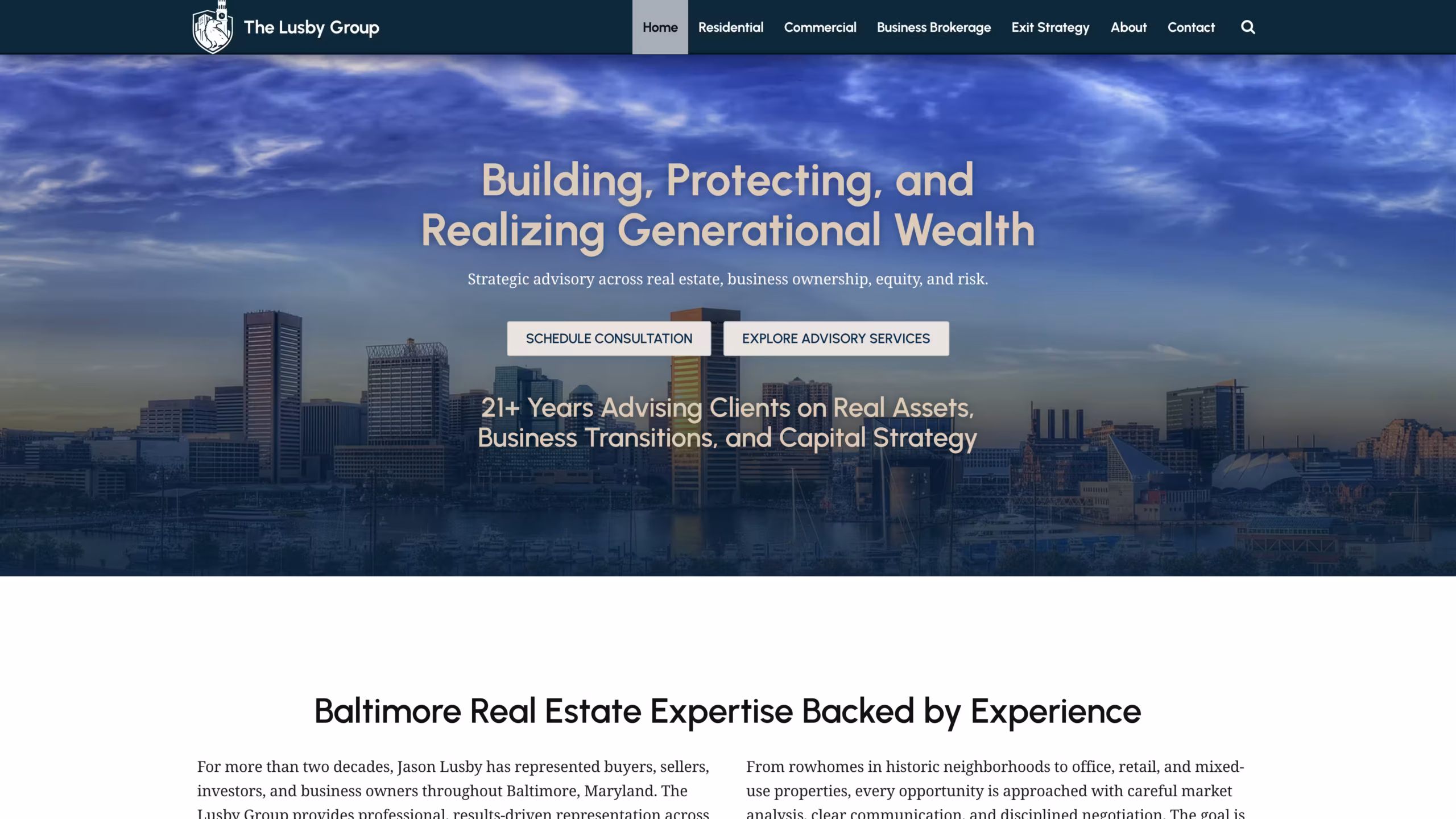 From the outset, the project required more than a standard real estate template. The Lusby Group’s services extend beyond traditional buying and selling, incorporating advisory-level offerings such as commercial representation, business brokerage, and long-term exit strategy planning. The site needed to communicate this broader positioning clearly, without overwhelming users or sacrificing usability.